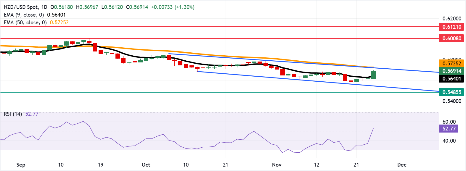 NZD/USD notiert um mehr als 1% höher und handelt während der asiatischen Handelsstunden am Mittwoch bei etwa 0,5690. Die technische Analyse des Tages-Charts signalisiert eine anhaltende bärische Tendenz, da der Preis des Paares innerhalb des absteigenden Kanal-Musters bleibt.
