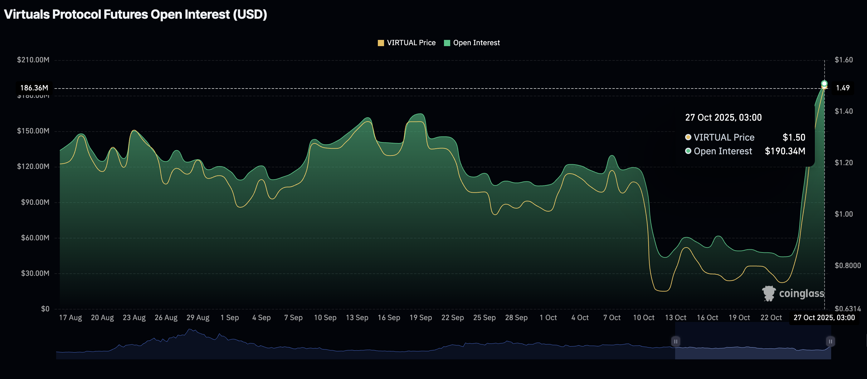 Der Token notiert weiterhin auf dem höchsten Stand seit Mitte August, gestützt durch eine deutlich gestiegene Nachfrage seitens der Kleinanleger. Laut CoinGlass-Daten ist das offene Interesse (Open Interest, OI) an VIRTUAL-Futures auf etwa 190 Millionen US-Dollar gestiegen – der höchste Wert seit Anfang August.