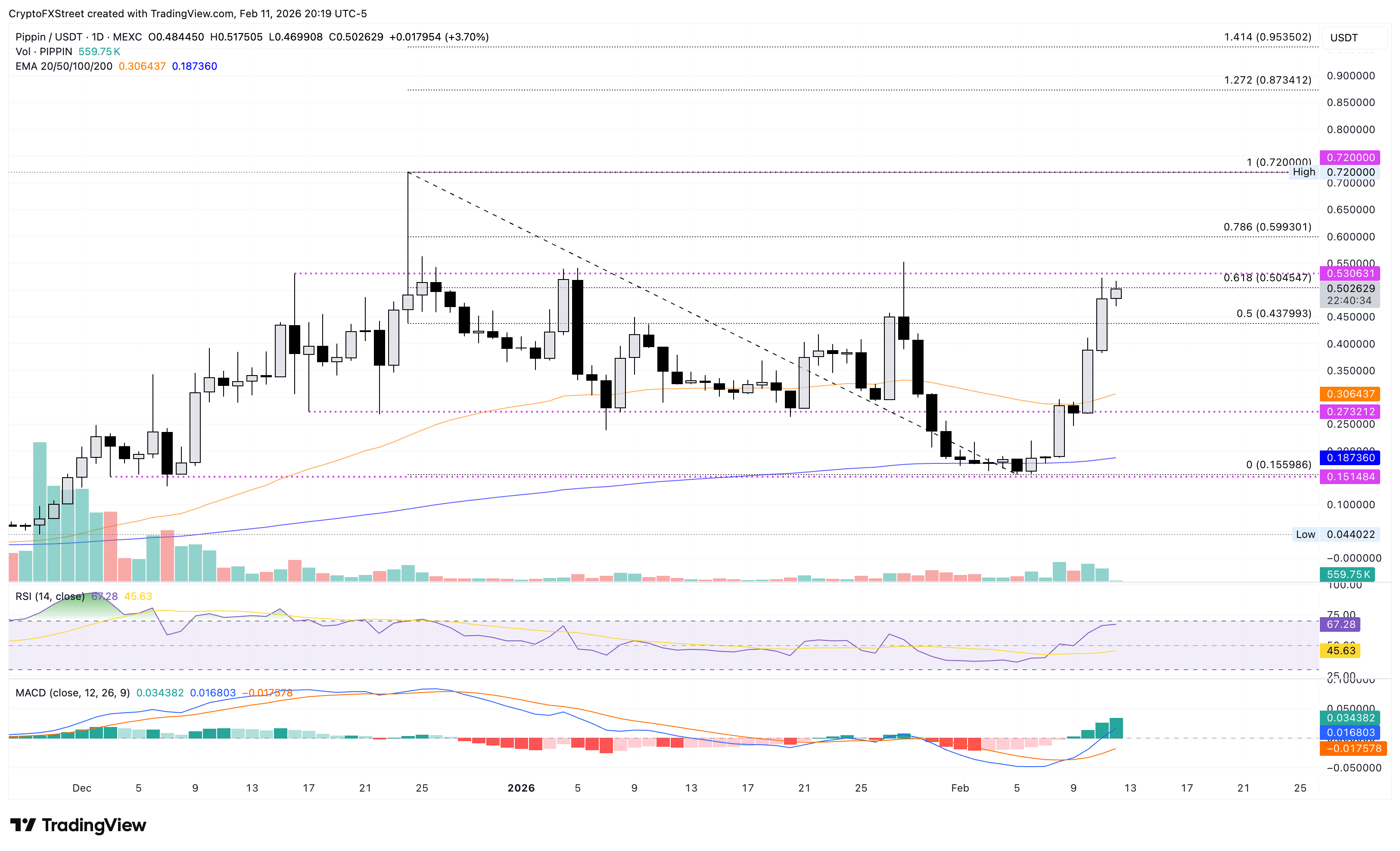 Am dritten aufeinanderfolgenden Tag der Erholung zielt PIPPIN auf das 61,8%-Fibonacci-Retracement-Niveau bei 0,5045 USD, gemessen vom Hoch am 24. Dezember bei 0,7200 USD bis zum Tief am 5. Februar bei 0,1559 USD. Die oberen Ziele liegen beim 78,6%-Fibonacci-Retracement-Niveau bei 0,5993 USD, gefolgt vom Hoch bei 0,7200 USD vom 16. Dezember.