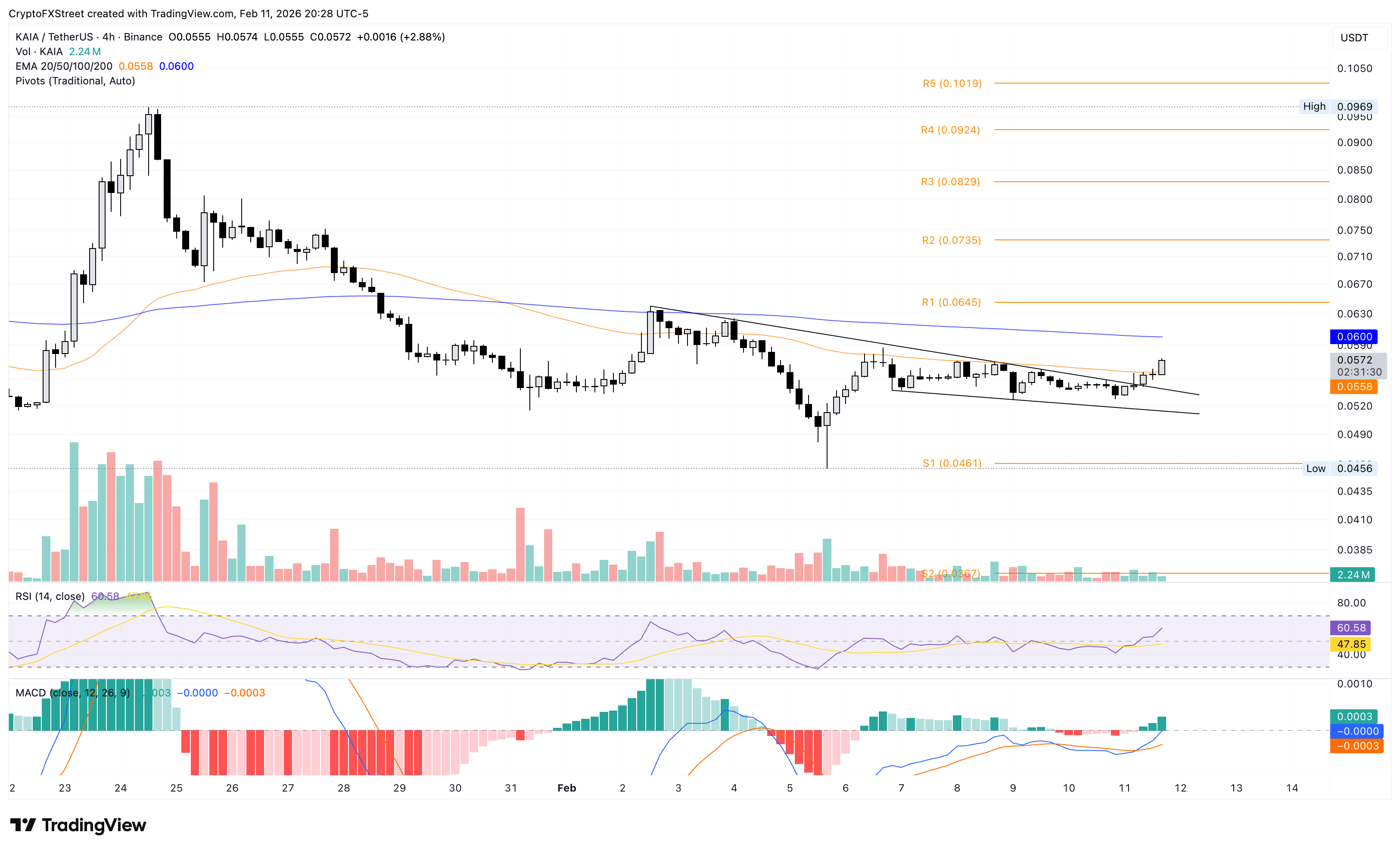 Kaia bricht aus einem fallenden Keilmuster im 4-Stunden-Chart aus, das seit Anfang Februar besteht, was eine Aufwärtsfreisetzung des gefangenen Momentums widerspiegelt. KAIA ist zum Zeitpunkt des Schreibens am Donnerstag um über 2% gestiegen und hat den 50-Perioden-EMA im selben Chart bei 0,0558 USD überschritten.