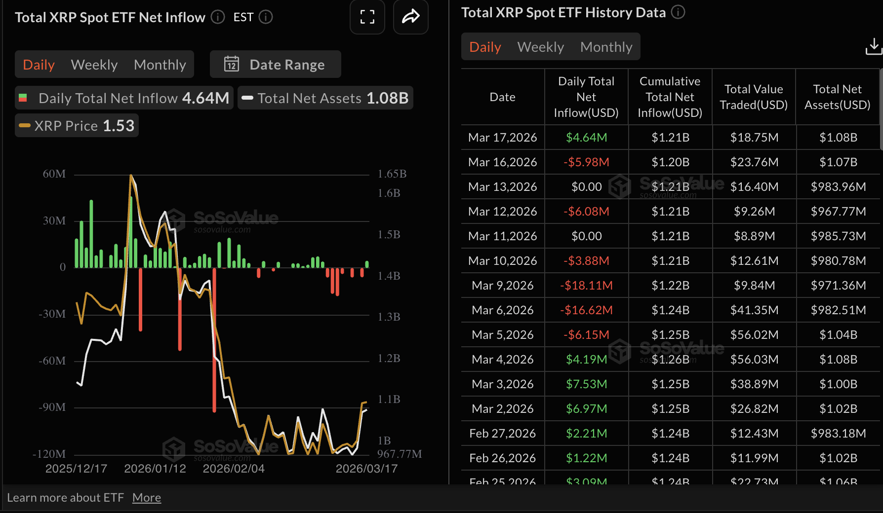Spot-ETFs auf XRP verzeichneten am Dienstag wieder Zuflüsse, nachdem es zuvor acht Tage lang nur geringe Aktivität gegeben hatte. Laut Daten von SoSoValue beliefen sich die Mittelzuflüsse auf 4,6 Millionen Dollar und lagen damit deutlich über den Abflüssen von knapp 6 Millionen Dollar am Montag.