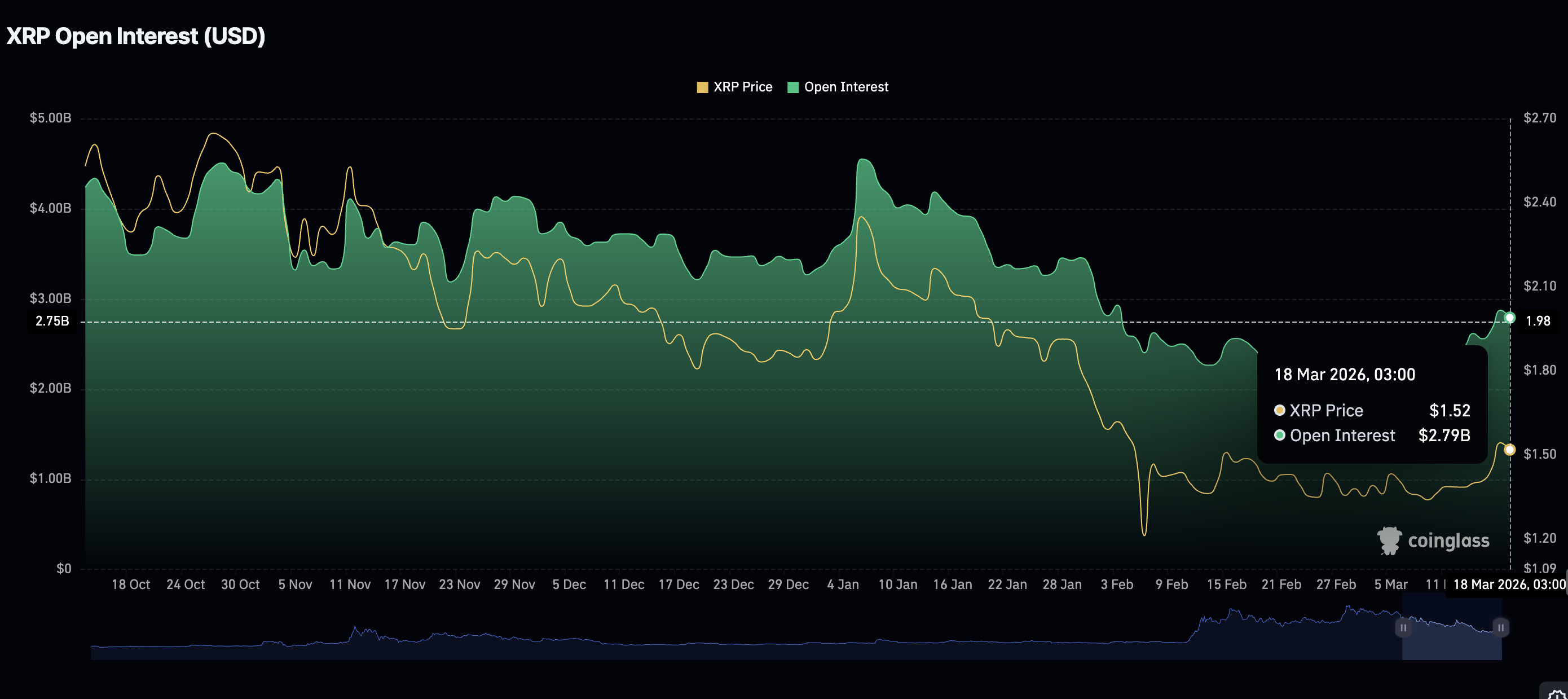 Der Derivatemarkt zeigt sich unterdessen schwächer: Das Open Interest (OI) bei Futures sank am Mittwoch auf 2,79 Milliarden Dollar, nach 2,87 Milliarden Dollar am Dienstag. Zuvor war das OI seit dem 4. März kontinuierlich von 2,11 Milliarden Dollar gestiegen, was auf ein wachsendes Interesse von Privatanlegern hindeutete, während der XRP-Kurs vom Monatstief bei 1,34 Dollar zulegte.
