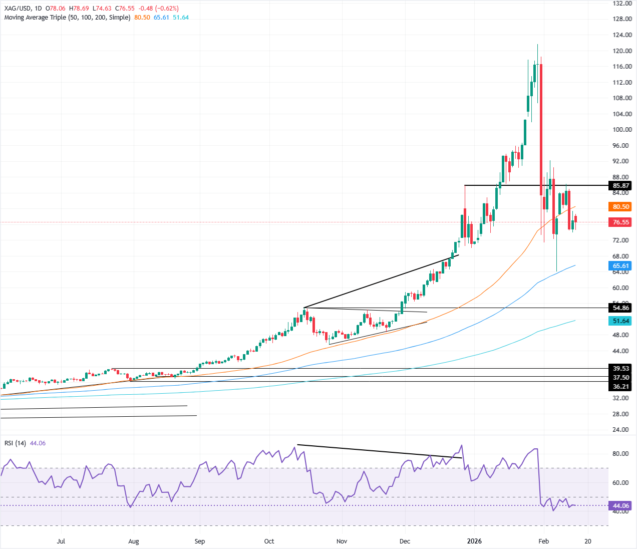 Nach der Bildung eines „bärischen Umkehrmusters“, das die Silberpreise von etwa 83,70 USD in den Bereich von 75,00 USD drückte, setzte XAG/USD in den letzten beiden Handelssitzungen den Handel innerhalb der Spanne von 75,00–80,00 USD fort.