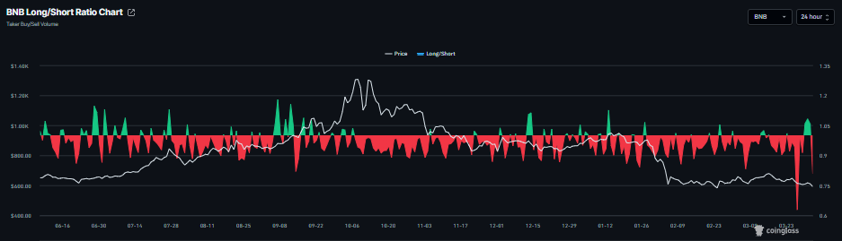 En el lado de los derivados, la relación largo-corto de Coinglass para BNB se situó en 0.80 el jueves, cerca de su nivel más bajo en un mes. La relación por debajo de uno indica un sentimiento bajista en el mercado, ya que los operadores apuestan a que el precio de BNB caerá.