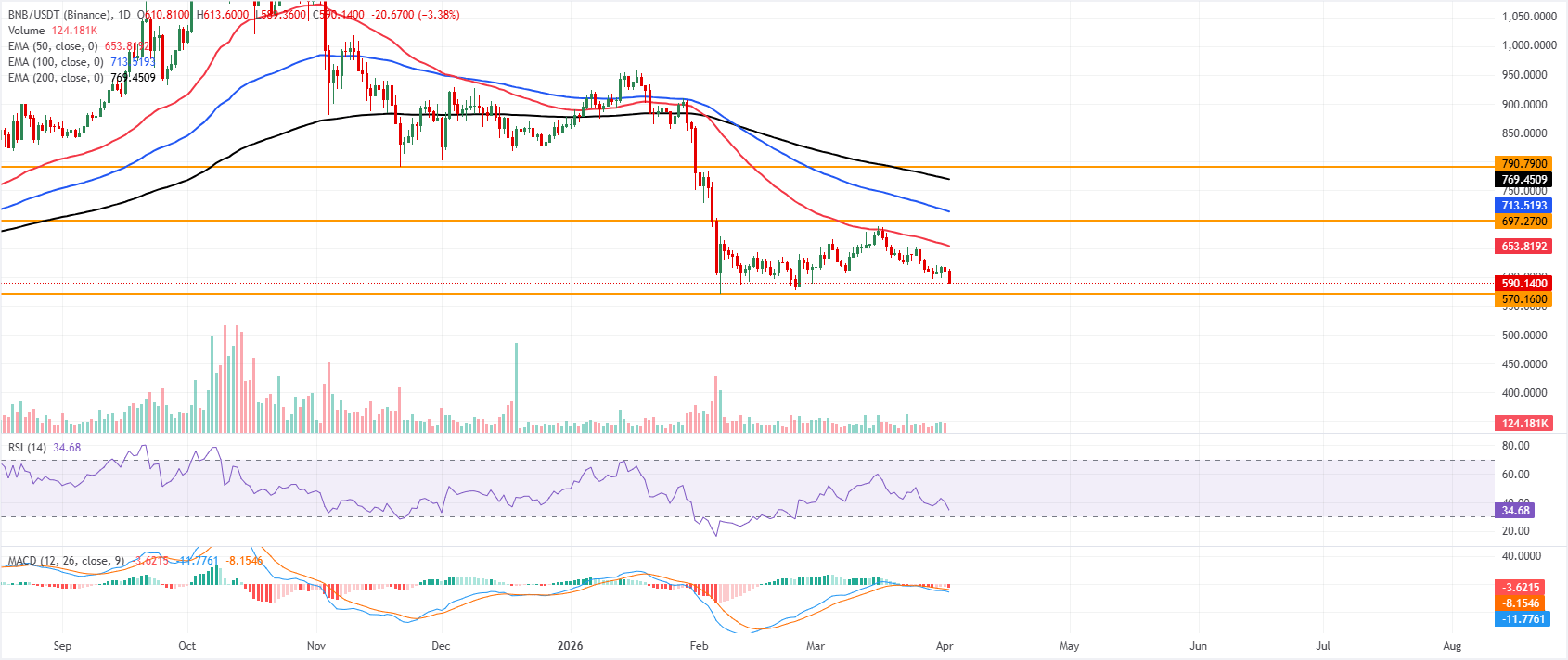 BNB (BNB), anteriormente conocido como Binance Coin, cotiza por debajo de 591$ al momento de escribir el jueves, extendiendo su racha de tres semanas a la baja. La corrección se fortaleció cuando el presidente de EE.UU., Donald Trump, dijo que la guerra en curso entre EE.UU. e Irán continuará hasta finales de abril, afectando el apetito de los inversores por activos más riesgosos. En el aspecto técnico, los indicadores de impulso sugieren una corrección más profunda para BNB en el corto plazo.