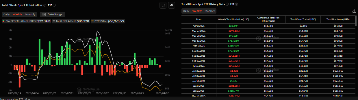 La demanda institucional de Bitcoin se mantuvo moderada la semana pasada. Los datos de SoSoValue muestran que los fondos cotizados en bolsa (ETFs) de Bitcoin al contado registraron una entrada leve de 22.34 millones de dólares la semana pasada. Esto destaca la indecisión entre los inversores institucionales, que no están dispuestos a aumentar la exposición a BTC en medio de la incertidumbre prevaleciente en el mercado.