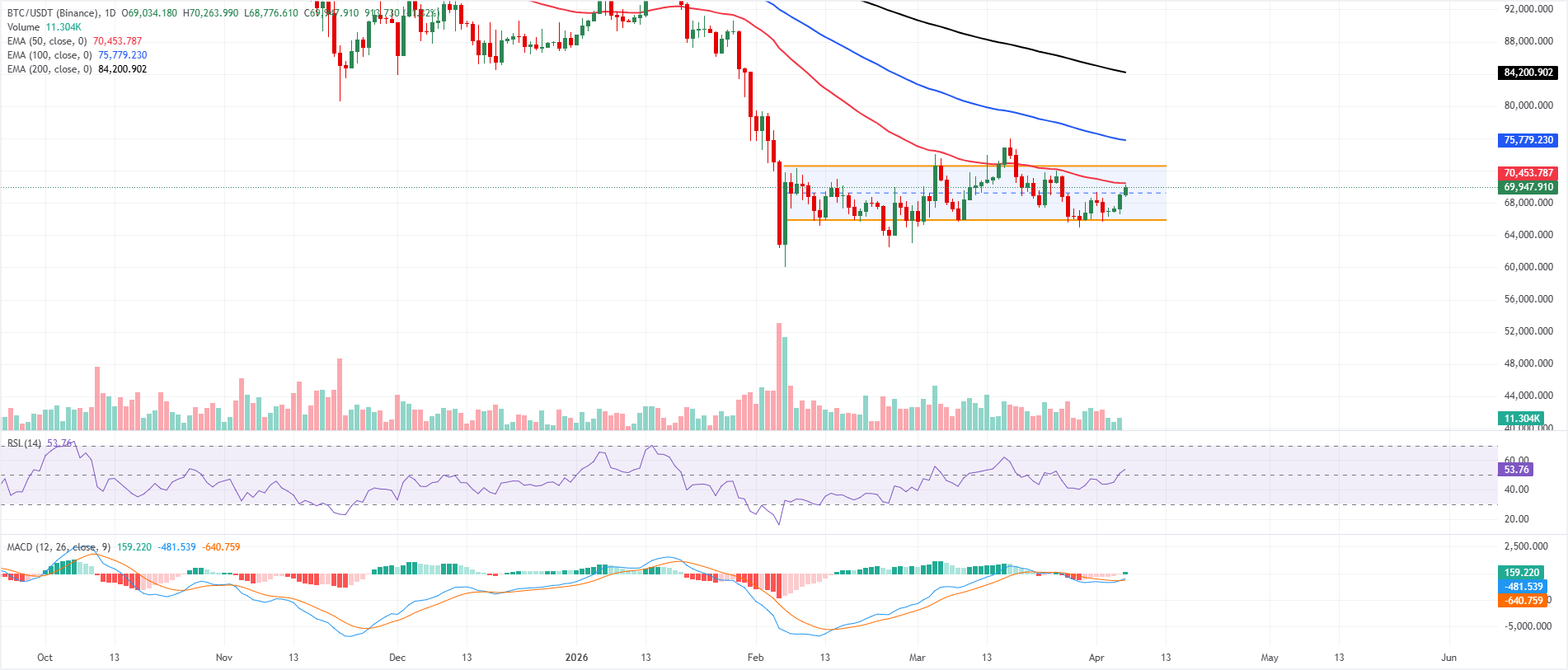 La resistencia inicial se alinea cerca de 70.500$, en la EMA de 50 días en 70.453$, y el techo del canal cerca de 72.600$. Un cierre diario por encima de ese límite superior debilitaría la configuración bajista actual y abriría el camino hacia la EMA de 100 días cerca de 75.800$.