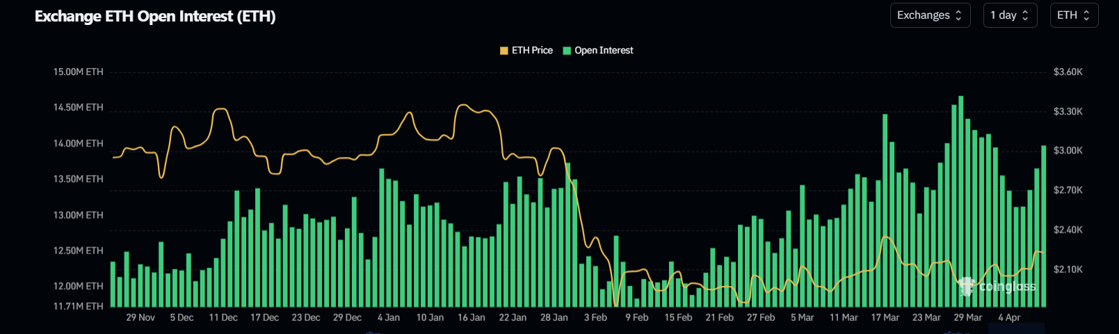 El interés abierto (OI) de la principal altcoin, el valor total de los contratos pendientes en un mercado de derivados, saltó a 14 millones de ETH. Este movimiento marca una recuperación tras una tendencia bajista en la exposición a derivados que se remonta al 28 de marzo, cuando el interés abierto disminuyó en aproximadamente 1.55 millones de ETH hasta el fin de semana pasado.