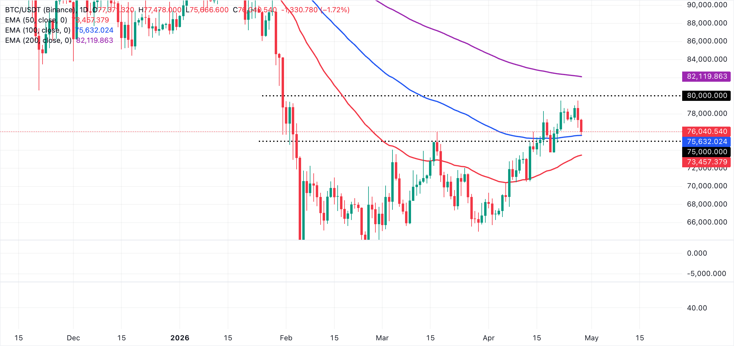 Los niveles clave de interés para los inversores incluyen el soporte en 75.000$ y la demanda en 70.000$. En el lado alcista, el umbral de 80.000$ es crítico para la continuación de la tendencia alcista del Bitcoin.
