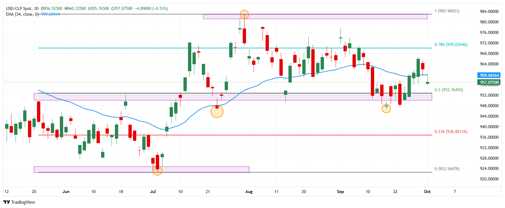 El USD/CLP registró un máximo del día en 960.32, encontrando vendedores agresivos que arrastraron la paridad a mínimos del 25 de septiembre 955.76. Actualmente, el USD/CLP opera sobre 956.97, cayendo un 0.52% el día de hoy.