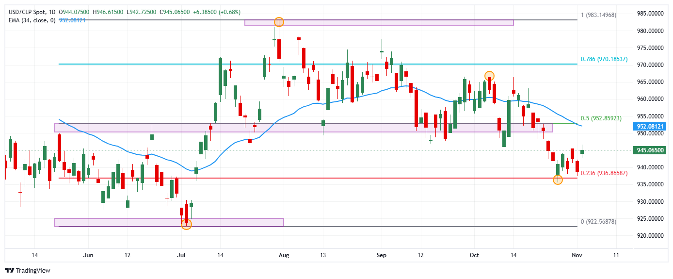 El USD/CLP reaccionó al alza en un soporte de corto plazo dado por el mínimo del 27 de octubre en 935.58. Al norte, la resistencia más cercana se encuentra en 966.41, máximos del 6 de octubre. La siguiente resistencia clave está en 982.94, punto pivote del 31 de julio.