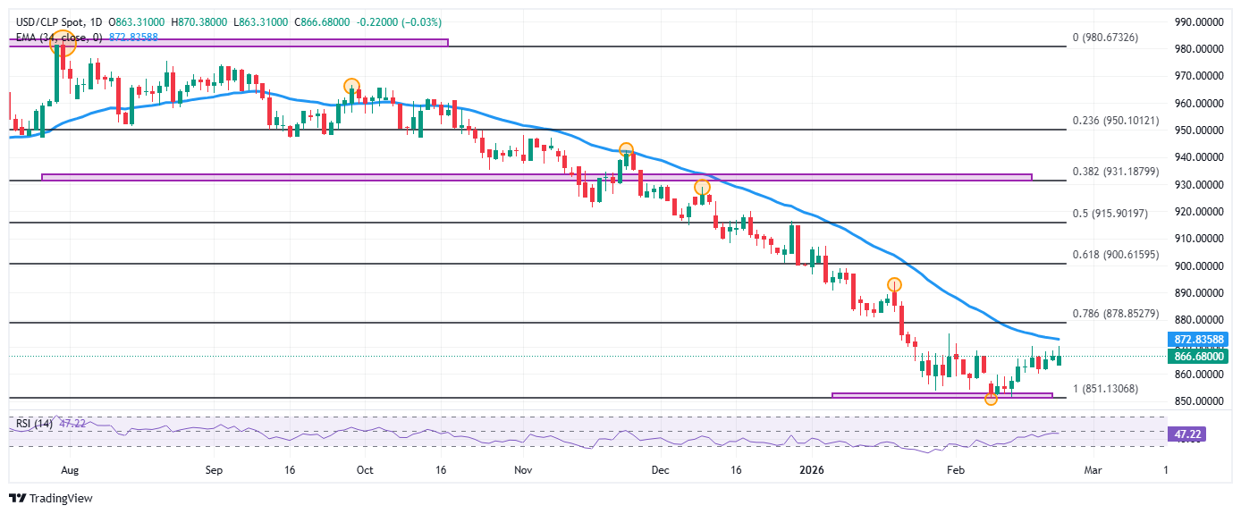 El USD/CLP reaccionó al alza desde mínimos del 19 de febrero en 863.31, atrayendo compradores que llevaron la paridad a máximos del 17 de febrero en 870.38. En estos momentos, el USD/CLP cotiza en 866.41, cayendo un 0.06% en la jornada del lunes.