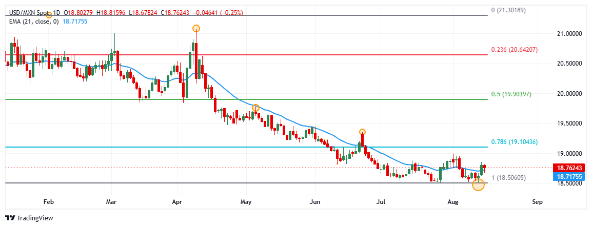 El Peso mexicano se negocia al alza, mientras que el USD/MXN cae un 0.23% el día de hoy, cotizando actualmente sobre 18.76.