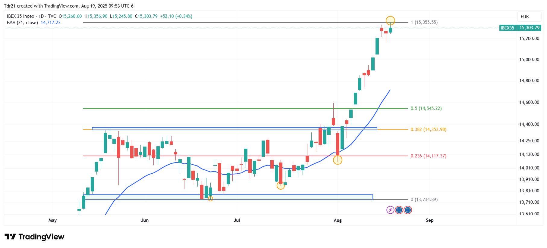 El Ibex 35 formó un soporte de corto plazo dado por el mínimo del 1 de agosto en 14.066. La siguiente zona de soporte importante está en 13.737, punto pivote del 23 de junio. Al alza, esperamos una posible toma de ganancias en 15.500, número cerrado que converge con la extensión al 127% de Fibonacci.