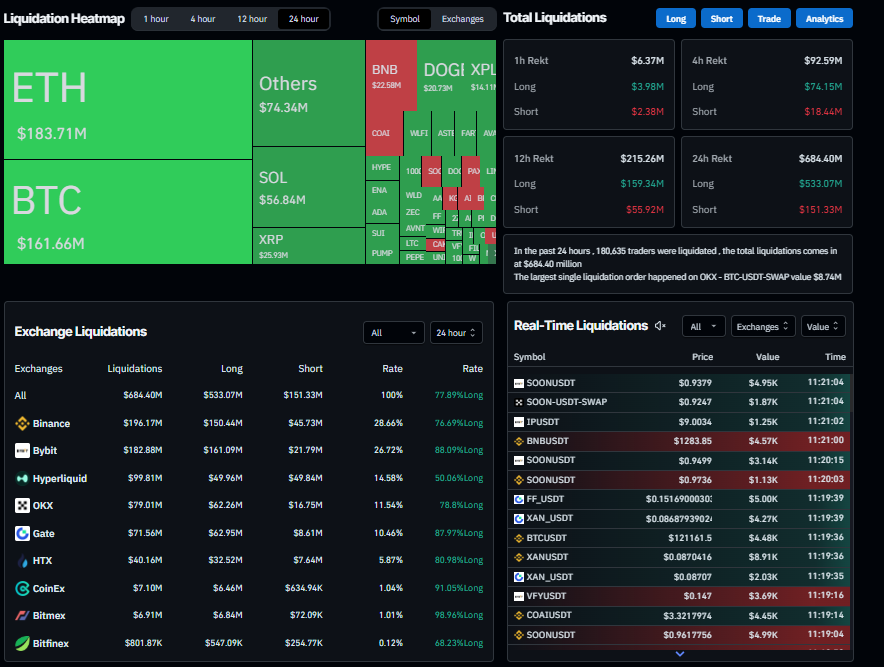 • CoinGlass data show that over $680 million in leveraged positions were wiped out across crypto markets in the past 24 hours.