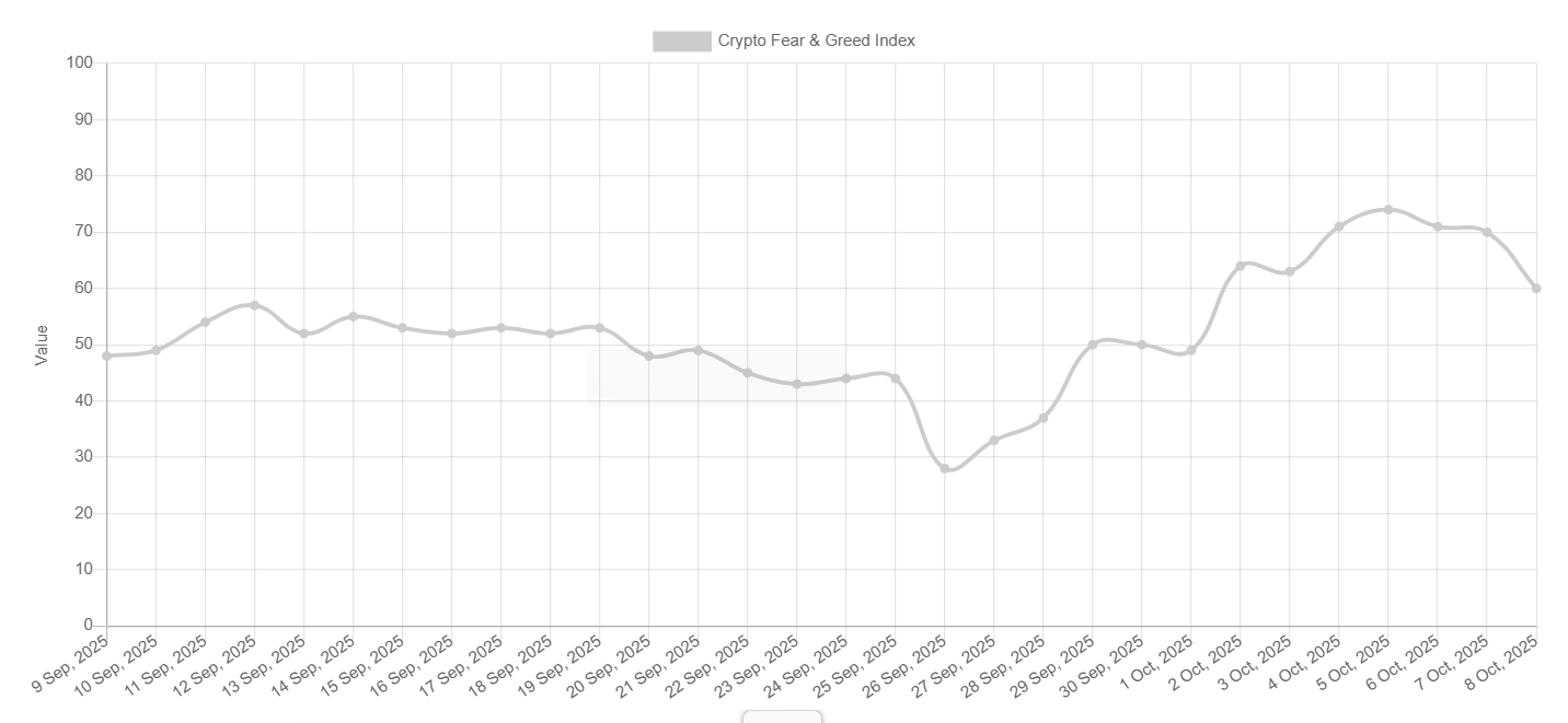 The Fear and Greed Index drops to 60 on Wednesday from Sunday’s high of 74, signaling a cooling of investor sentiment and a shift from strong greed toward a more cautious outlook.