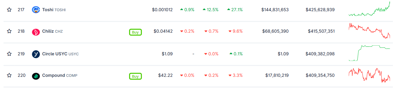 CoinGecko data below show that Toshi’s market capitalization reached $425.62 million on Thursday, surpassing other altcoins, such as Chiliz (CHZ) and Compound (COMP), and securing the 217th spot in the overall crypto market capitalization table.