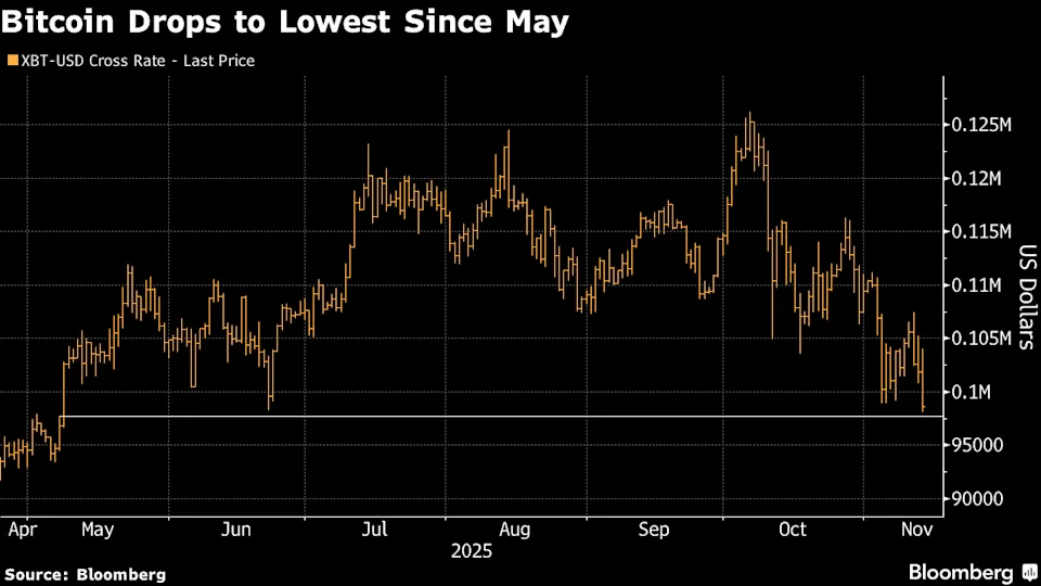 The digital currency fell to 100,447 now and once dropped as much as 3.9% to $97,956, intensifying a slump that’s wiped out more than $450 billion in value since early October. Once-reliable sources of support — including large investment funds, ETF allocators, and corporate treasuries — have stepped back, removing a key prop from this year’s rally and triggering a new phase of market fragility.