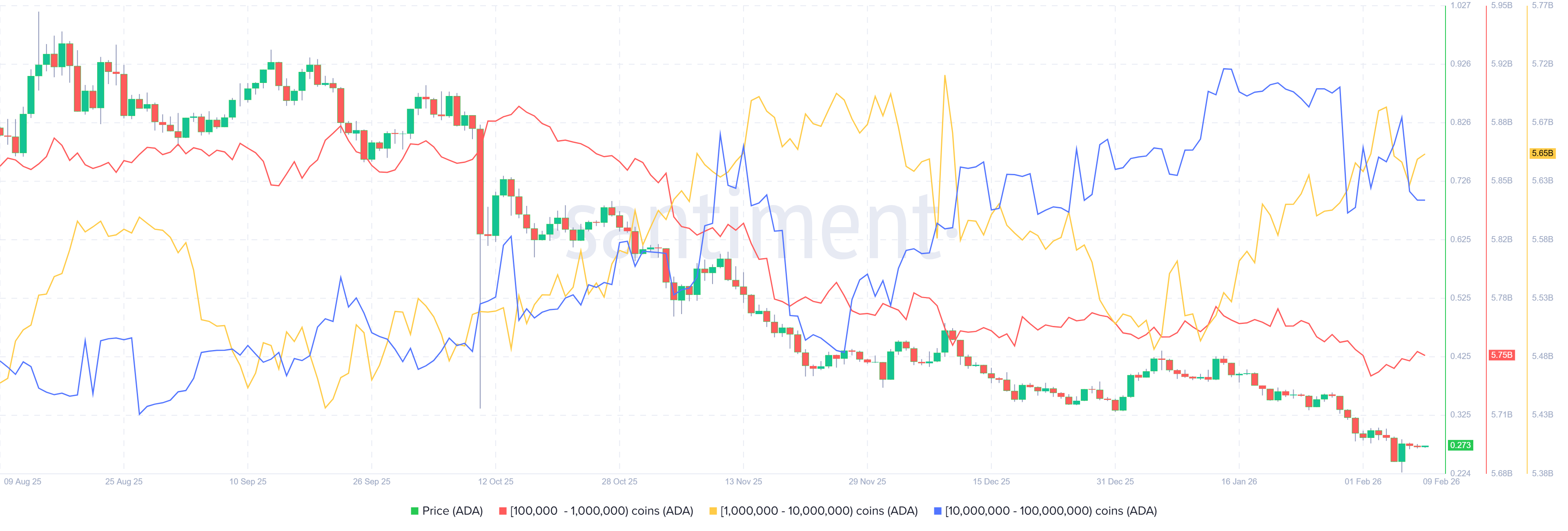 The metric indicates that whales holding between 10 million and 100 million (blue line) ADA tokens have shed a total of 180 million tokens since Friday. During the same period, holders with 1-10 million (yellow line) have accumulated just 10 million ADA tokens, bringing the net to 170 million tokens sold.