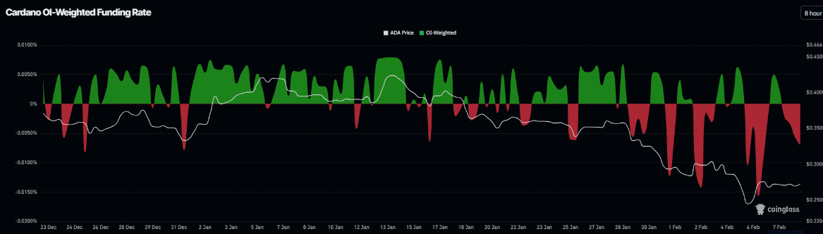 Moreover, Cardano’s funding rate data also supports the bearish outlook. The metric turned negative on Sunday and currently stands at -0.0070%, indicating shorts are paying longs and suggesting bearish sentiment toward ADA.