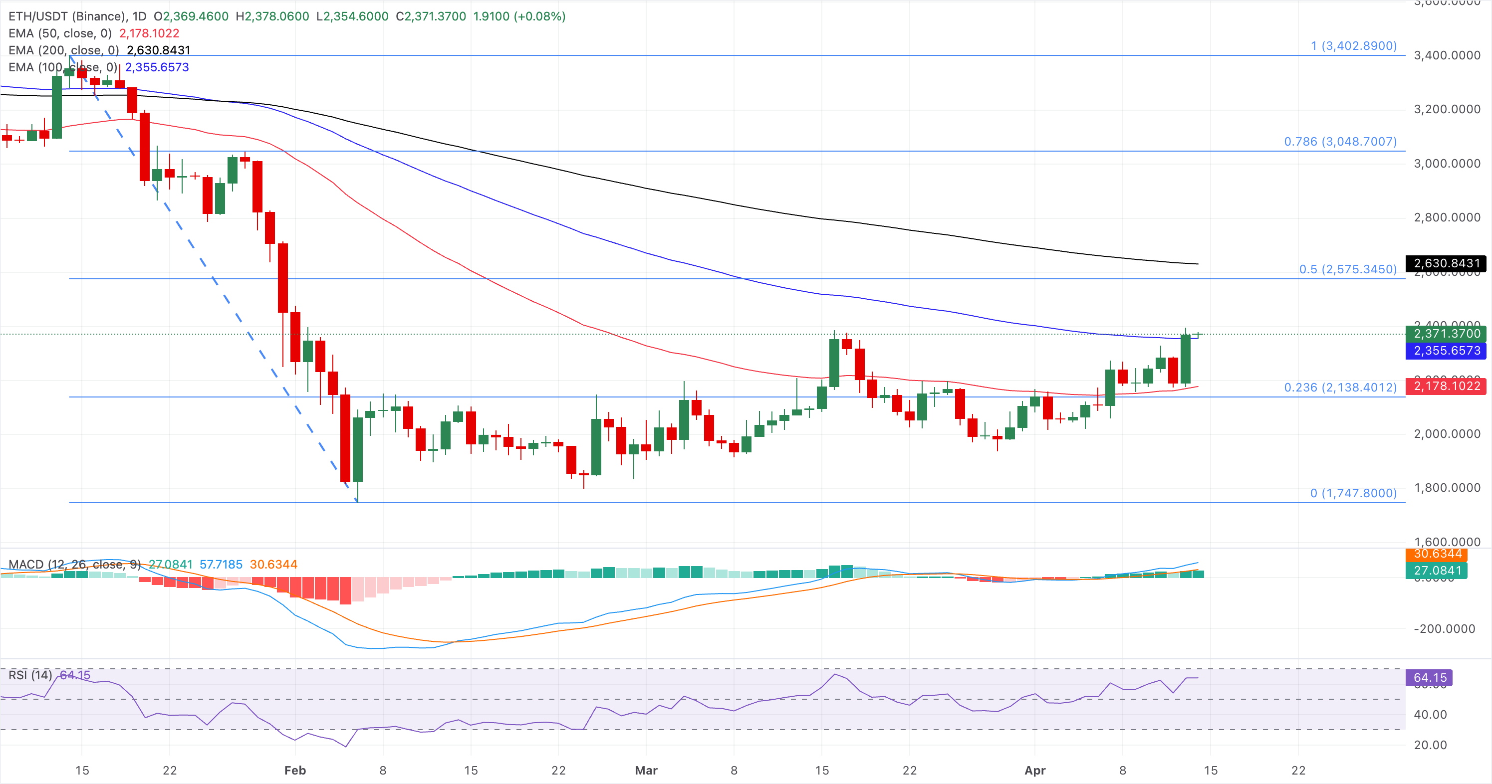 Ethereum maintains a constructive bullish tone as it holds above the 50-day EMA near $2,178 and the 100-day EMA around $2,355. The 50% retracement of the latest swing from $3,402 to $1,747 at roughly $2,575 is acting as the first upside barrier, while the 200-day EMA near $2,631 stays well above the price and caps the broader recovery outlook.
