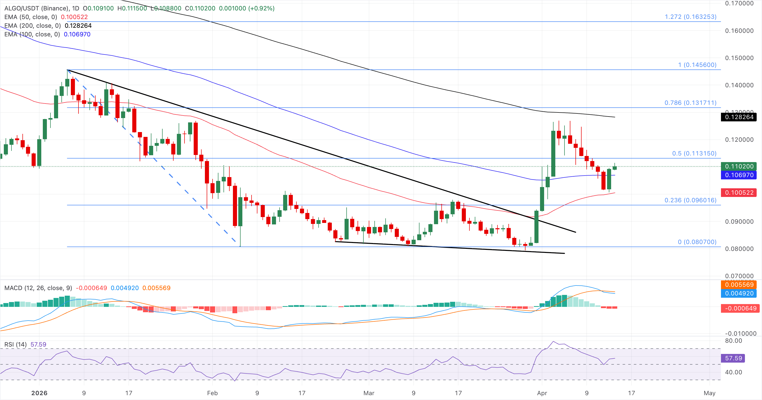 Algorand is maintaining a constructive near-term bias as it remains above its 50-day and 100-day EMAs at $0.1005 and $0.1070, respectively. This positioning suggests the recent pullback is a pause within an emerging bullish phase, although price is still capped below the 50% retracement of the downswing from $0.1456 to $0.0807 at $0.1132, while the RSI near 58 shows moderate positive momentum that is starting to cool in line with a flattening MACD line.