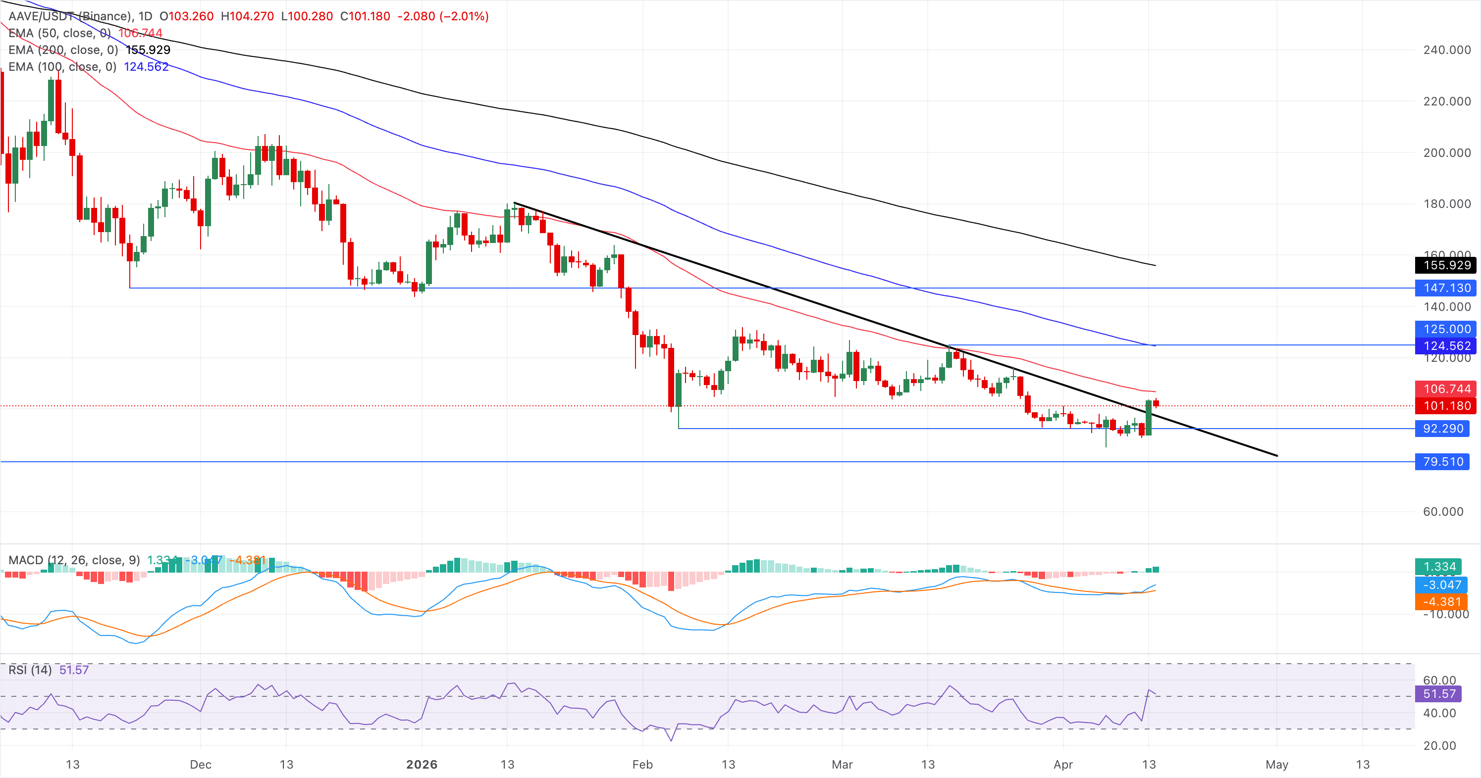 AAVE remains in a broader bearish context as price holds below the 50-day, 100-day, and 200-day EMAs, with the nearest dynamic cap coming from the 50-day EMA around $106.74. The recent break above the descending trendline, now offering support near $97.32, suggests downside pressure is easing, while the MACD turns positive and the RSI hovers just above 50, hinting at a mild improvement in short-term momentum rather than a confirmed trend reversal.