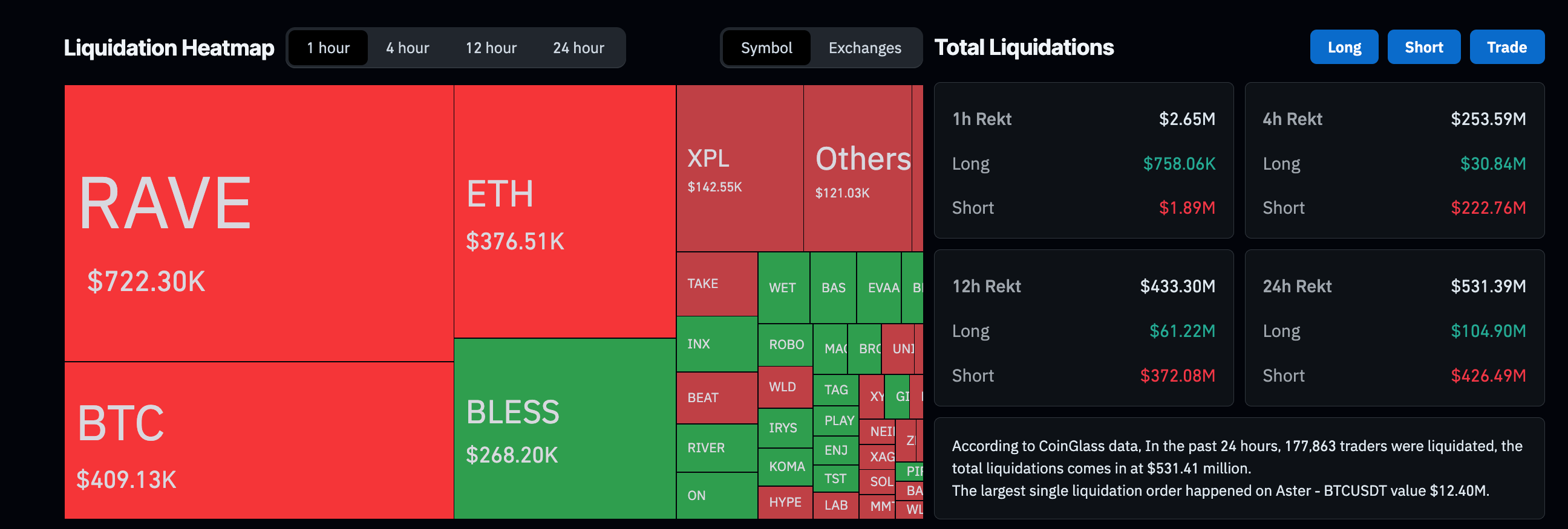 The peace negotiations are boosting risk-on sentiment in the cryptocurrency market. CoinGlass data shows $531 million in total liquidations over the last 24 hours, driven by $426 million in short liquidations, suggesting a bearish wipeout.