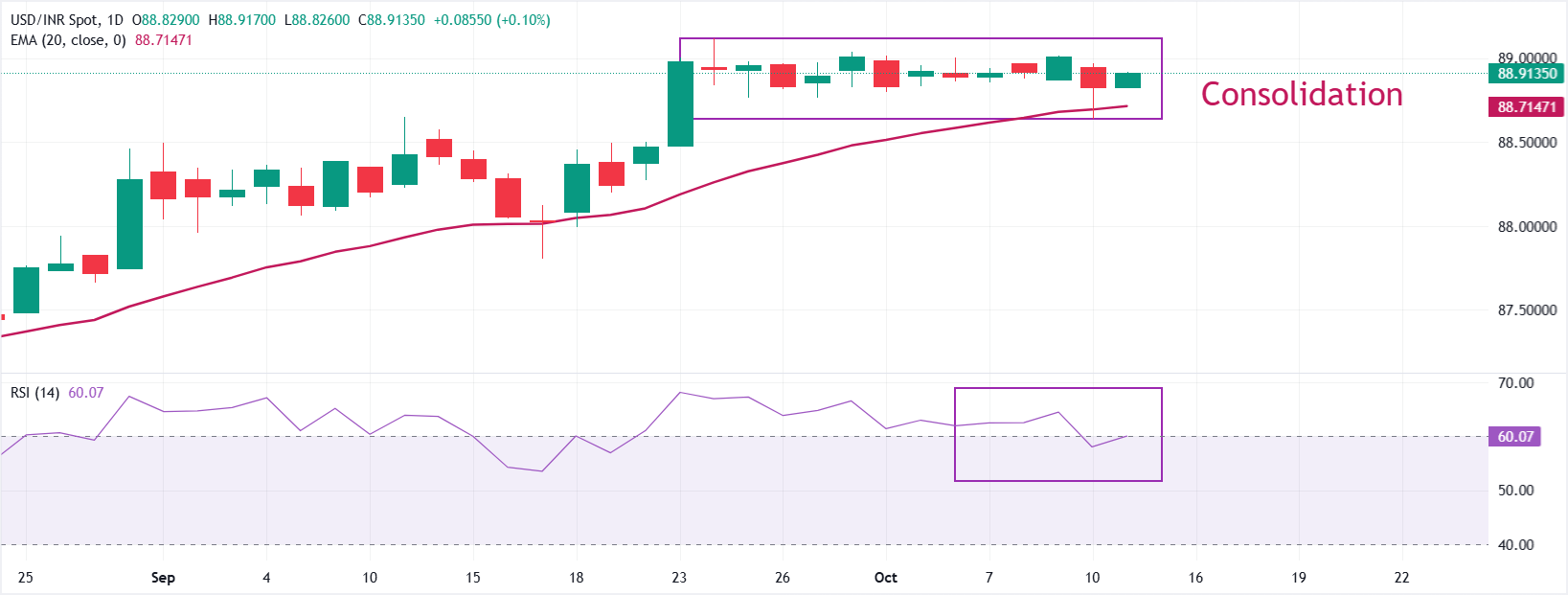 The Indian Rupee continues to hold its all-time low around 89.10 against the US Dollar for almost 20 days. The near-term trend of the pair remains bullish as the 20-day Exponential Moving Average (EMA) slopes higher around 88.71.