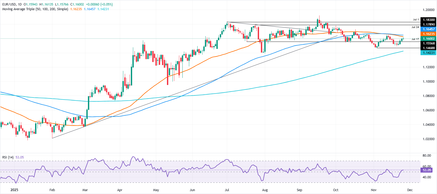 EUR/USD trades sideways, with buyers unable to decisively break above the 1.1600 mark, to extend its advance past the confluence of the 50- and 100-day Simple Moving Averages (SMA) near 1.1620/1.1646. Momentum remains mildly bullish, shows the Relative Strength Index (RSI), but the indicator has flattened, signaling that consolidation is likely to persist in the near term.