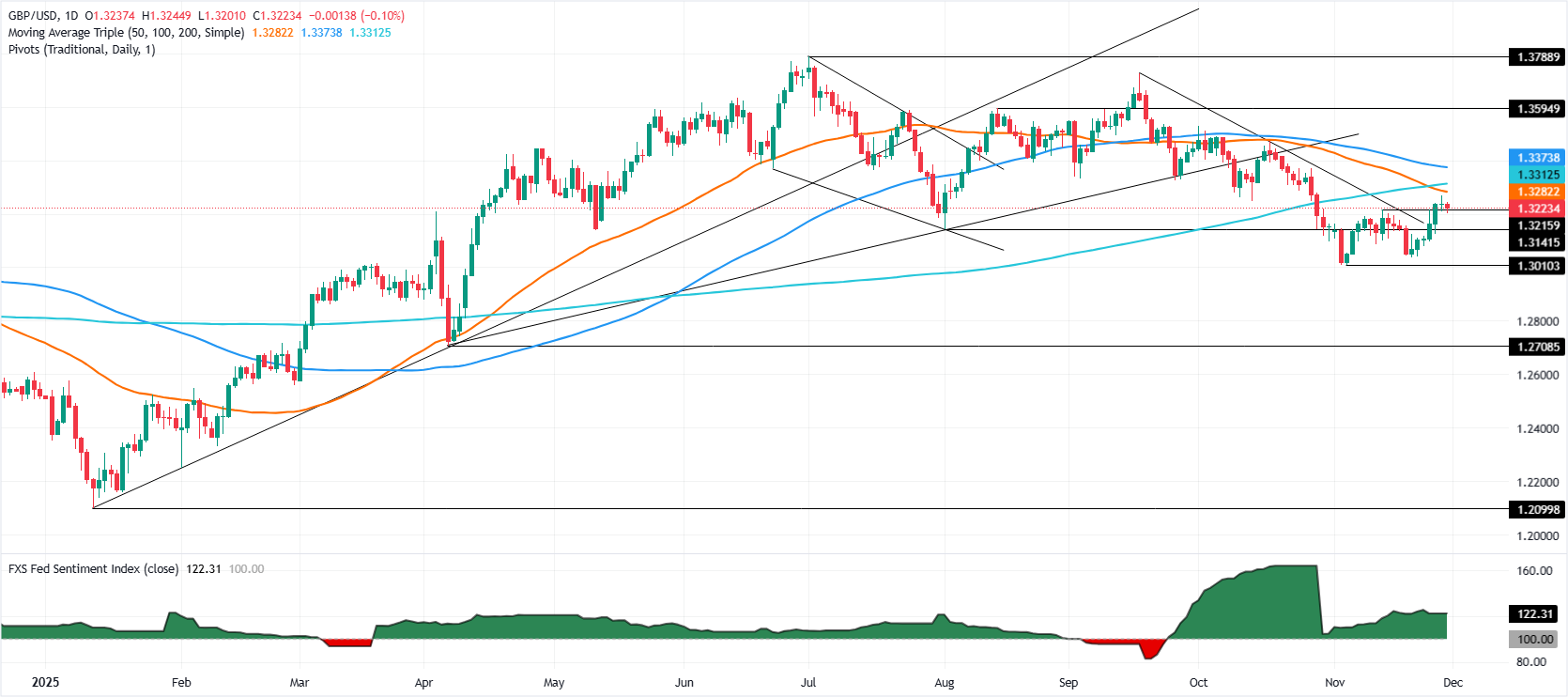 GBP/USD dips during the North American session, despite heading to end the week with gains of over almost 1%, after the financial markets digest the Autumn Budget. The pair trades at 1.3221 after retreating from a daily high of 1.3245.