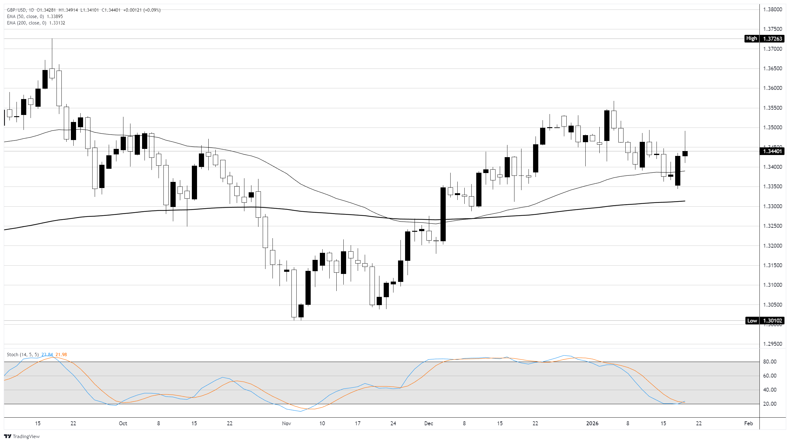 GBP/USD has shown a modest upward bias this week, largely driven by broad-based US dollar weakness rather than strong UK fundamentals. The pair has rebounded from recent lows as geopolitical risk and tariff concerns undermined confidence in the greenback, allowing Sterling to advance even as UK macro data disappointed.