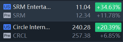Circle and SRM Entertainment jumped again in premarket trading on Monday. SRM Entertainment surged 12% while Circle jumped 7%.