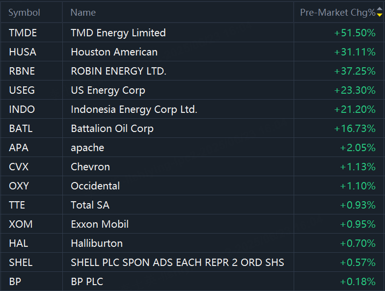 Oil Stocks jumped in premarket trading on Monday. TMD Energy rose 52%; Robin Energy rose 37%; Houston American rose 31%; US Energy rose 23%; Indonesia Energy rose 21%; Battalion Oil rose 17%; Apache rose 2%; Chevron and Exxon Mobil rose 1%.