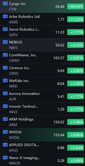 Nvidia-Linked Shares Shined. Cyngn rocketed 468%; Arbe Robotics up 11%; Serve Robotics Up 8%; Nebius up 4%; CoreWeave up 3.8%.