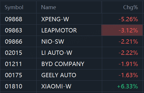 Auto stocks sank in Hong Kong. XPeng fell 5%; Leapmotor fell 3%; NIO, Li Auto, BYD, and Geely Auto fell 2%; while Xiaomi jumped 6%.
