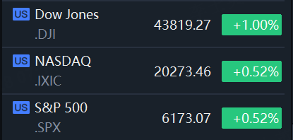 The Dow Jones Industrial Average rose 432.43 points, or 1.00%, to 43,819.27, the S&P 500 gained 32.05 points, or 0.52%, to 6,173.07 and the Nasdaq Composite gained 105.55 points, or 0.52%, to 20,273.46.