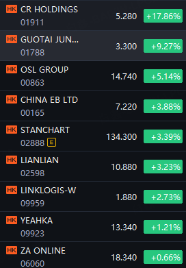 HK Stablecoin Stocks Shine. CR Holdings up 18%; Guotai Junan up 9%; OSL Group up 5%; China EB, Lianlian and Stanchart up 3%.