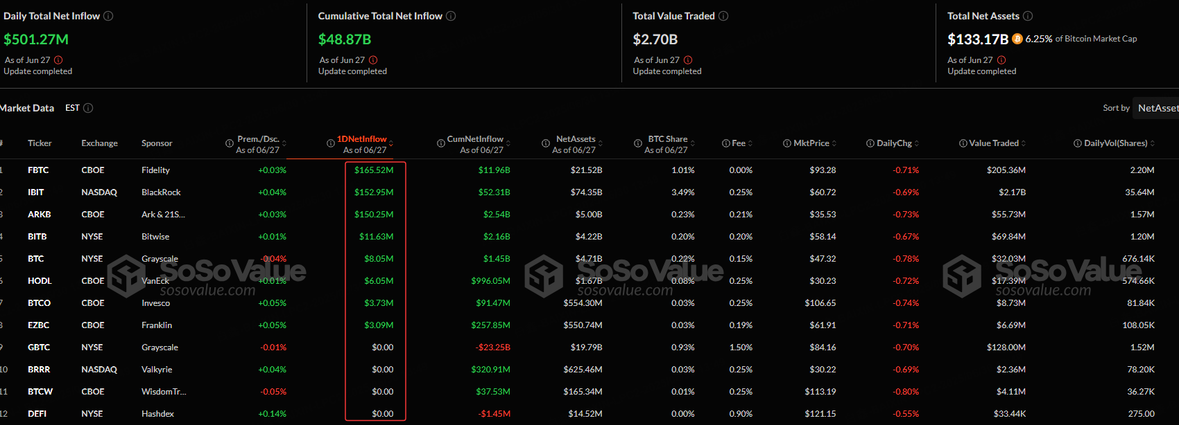 The Bitcoin spot ETF with the highest net inflow on June 27 was Fidelity Wise Origin Bitcoin Fund , with a net inflow of $165.52 million. Following that was iShares Bitcoin Trust ETF , with a net inflow of 152.95 million, according to SoSoValue.