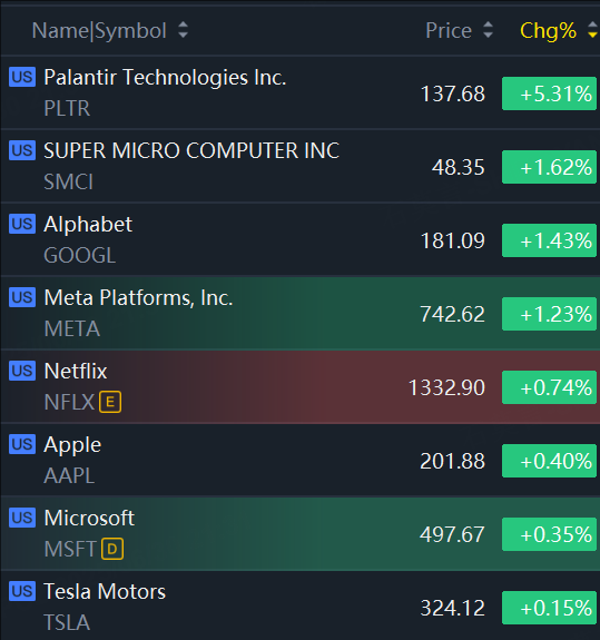 Palantir gained 5.3%; Super Micro up 1.6%; Alphabet, Meta rose over 1%.