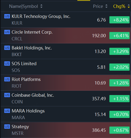 Crypto Shares Gain. KULR Technology up 8%; Circle Rockets 6%; Bakkt Holdings up 3%; SOS Ltd up 2%.