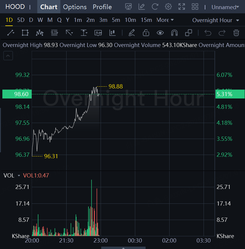 Robinhood jumped 5% in overnight trading after gaining 12.8% on Monday. Shares of the cryptocurrency exchange hit an all-time intraday high of $93.36 on Monday after Robinhood unveiled a slate of new products including "tokens" that will allow customers in the European Union to trade U.S.-listed stocks and exchange-traded funds.