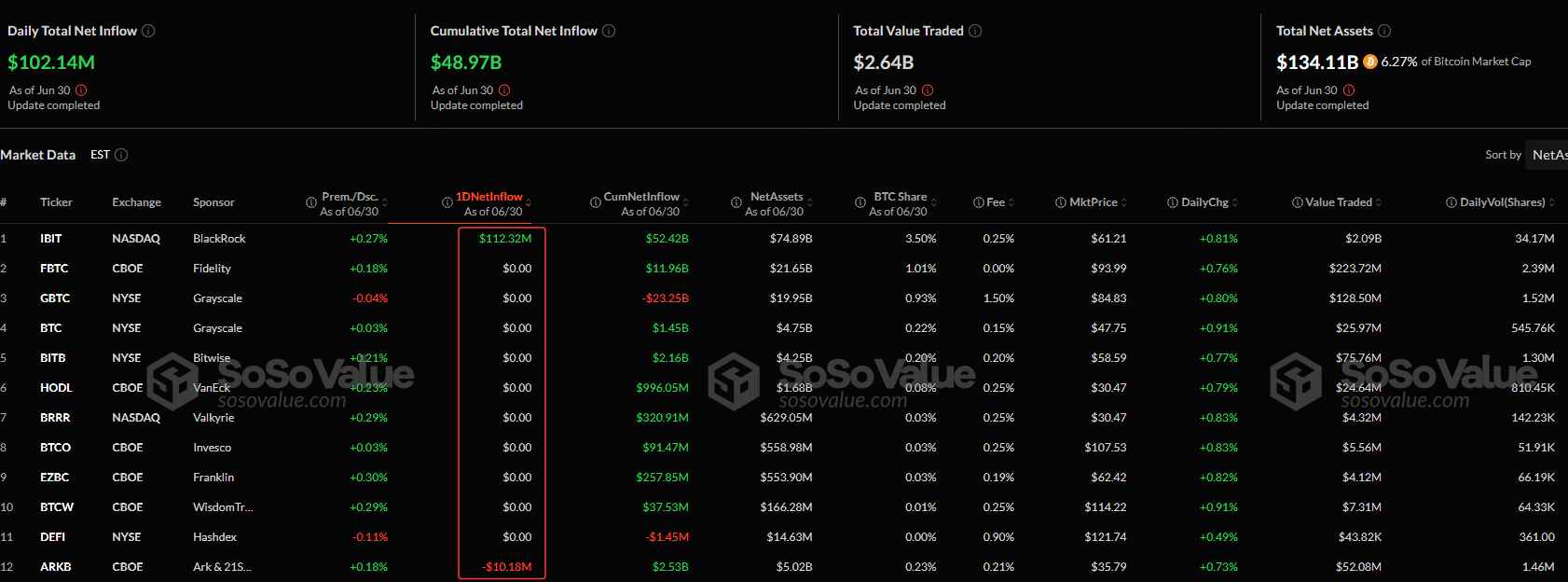 The Bitcoin spot ETF with the highest net inflow on June 30 was iShares Bitcoin Trust ETF, with a net inflow of $112.32 million.
