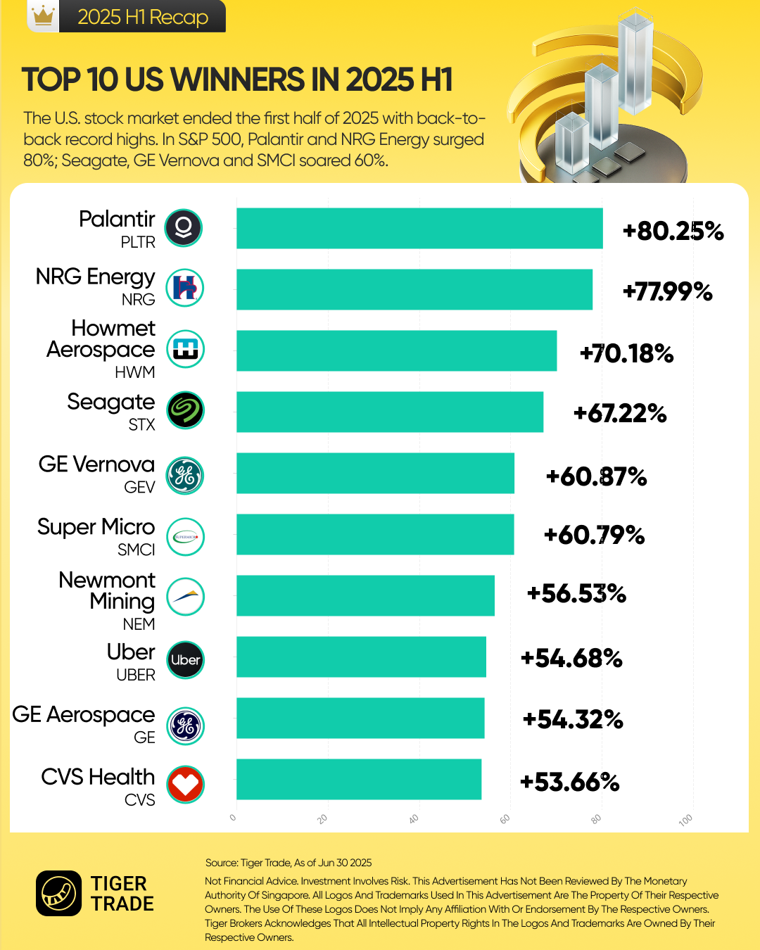 Other stocks among the S&P 500’s top 10 performers through the year’s first half include: Howmet Aerospace Inc. surging 70%, SUPER MICRO COMPUTER INC up 60%; Newmont Mining , Uber, GE Aerospace and CVS Health up 50%.