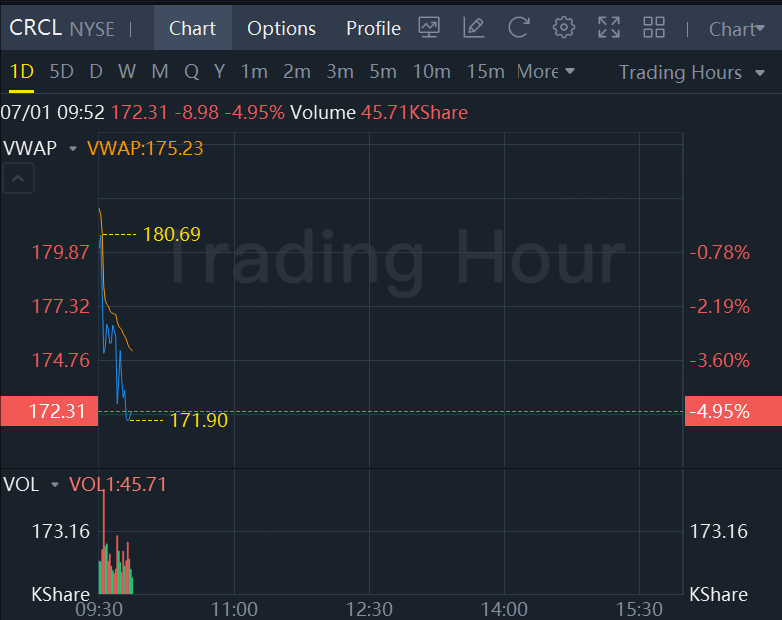 JPMorgan initiated Circle with Underweight rating and target price $80. The shares plunged 15.5% on Friday.