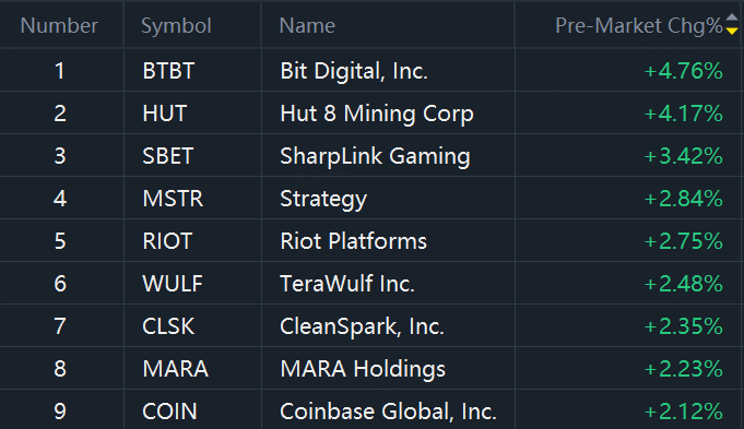 Crypto shares shined in premarket trading. Bit Digital, Hut 8 up over 4%; SharpLink Gaming, Strategy up around 3%; Riot Platforms, MARA up over 2%.