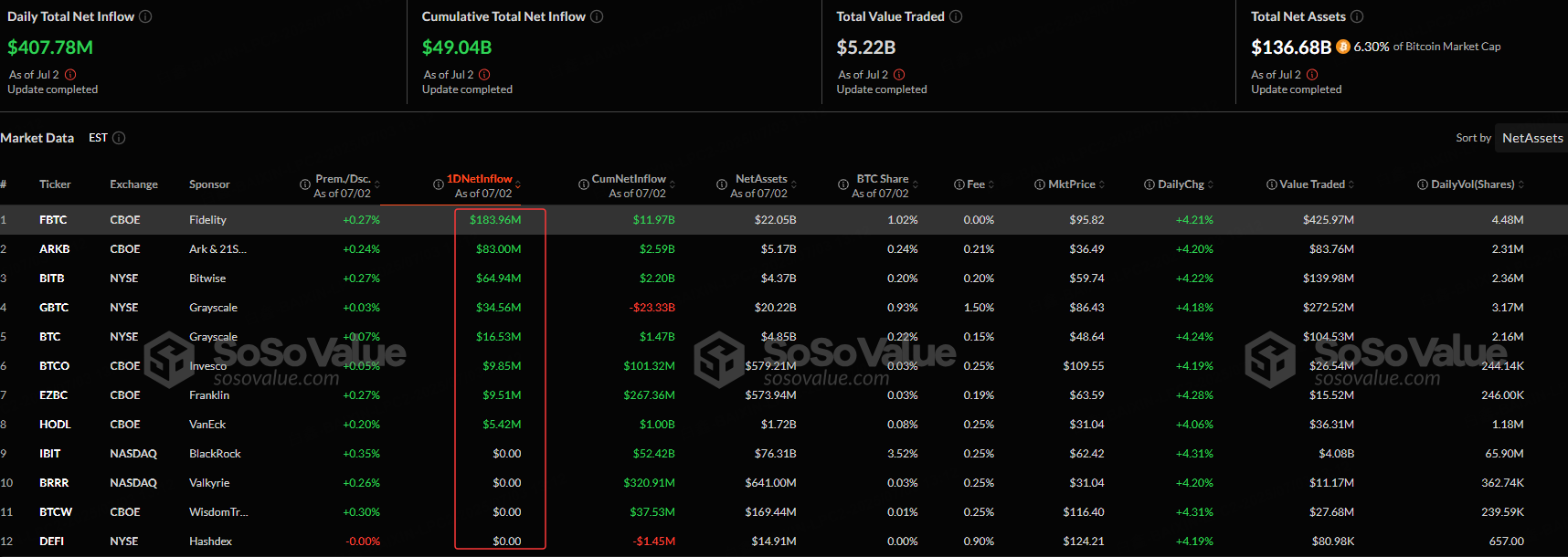 The Bitcoin spot ETF with the highest net inflow on July 2 was Fidelity Wise Origin Bitcoin Fund, with a net inflow of $183.96 million. Following that was ARK 21Shares Bitcoin ETF, with a net inflow of 83 million, according to SoSoValue.