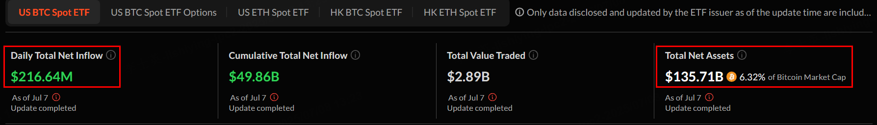 The overall net inflow of the US Bitcoin spot ETF on Monday was $216.64 million. The total net asset value of Bitcoin spot ETFs is $135.71 billion, and the ETF net asset ratio (market value compared to total Bitcoin market value) is 6.32%.
