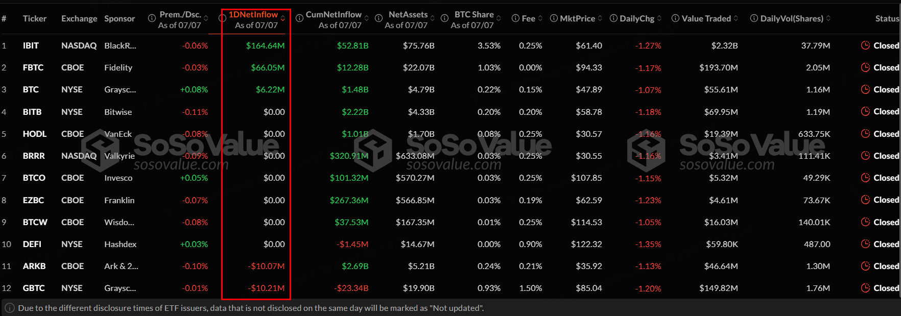 The Bitcoin spot ETF with the highest net inflow on July 7 was iShares Bitcoin Trust ETF (IBIT), with a net inflow of $164.64 million. Following that was Fidelity Wise Origin Bitcoin Fund (FBTC), with a net inflow of $66.05 million, according to SoSoValue.
