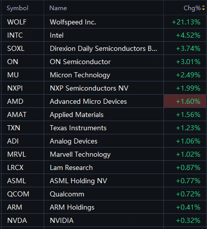 Semiconductor shares rose in Tuesday trading. Wolfspeed up 21%; Intel rose 5%; SOXL rose 4%; ON Semiconductor up 3%; AMD, Micron rose 2%; Marvell up 1%; Nvidia up 0.3%.